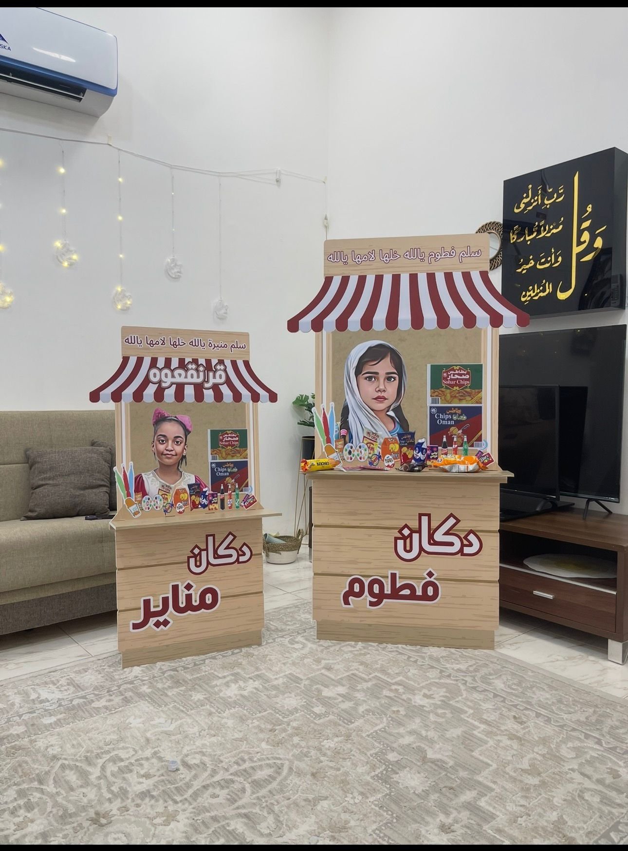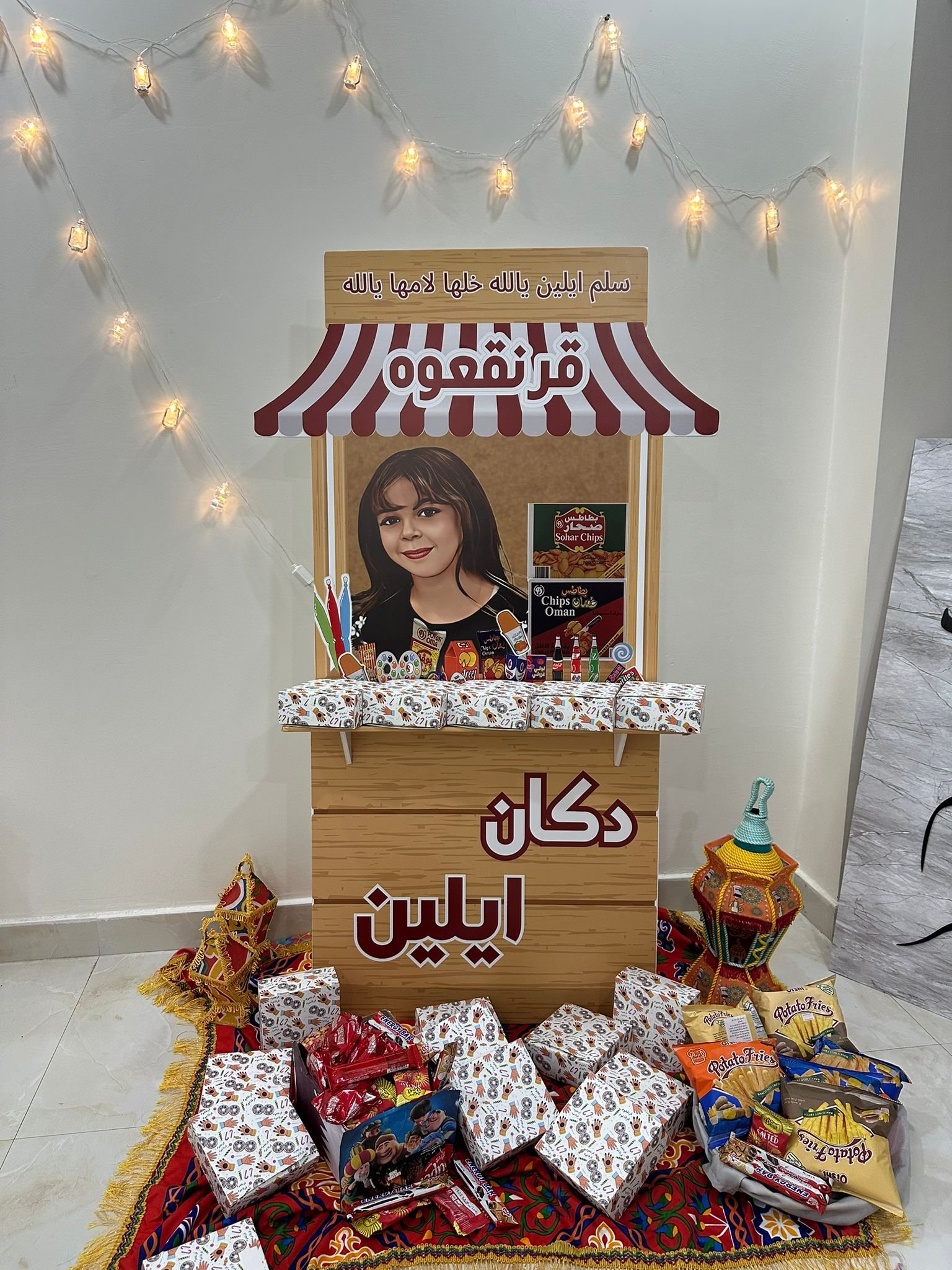 مع صورة انيمي للطفل وكتابة الاسم ورف ومعاه بوكسات قرنقعوه هدية